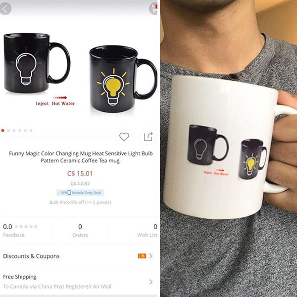 This is one of the most clever, simple scams out there: just give the consumer exactly what they ordered, down the to T. As you can see, in the picture on Amazon, the seller showed a picture of a coffee cup with a lightbulb that brightens when hot liquids are in the cup. That’s quite the scam for $15.00.