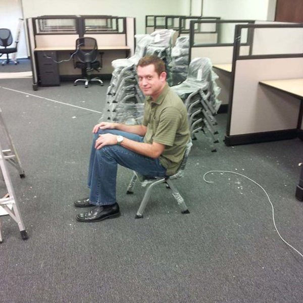Here we have another person who clearly didn’t read the fine print when he was ordering his chairs where it said that they were only for per-scholers. He seems to have gotten everything in his office in place and then he got all of these chairs which he will surely have zero use for.